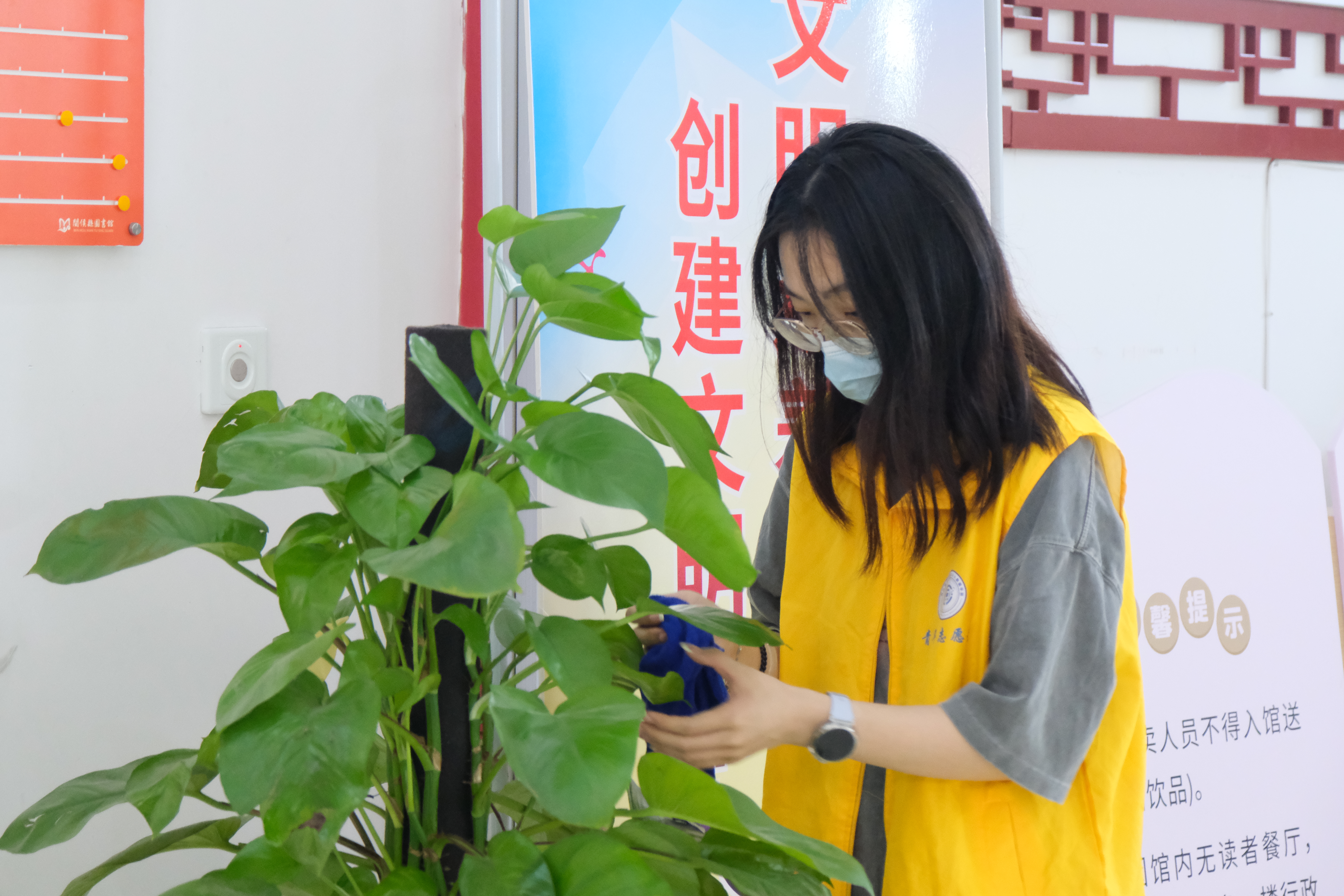 本次清扫志愿主要针对闽侯县图书馆的三楼外借部和一楼少儿部。在图书馆工作人员的安排下,志愿者们被分成两组。一组来到三楼外借部,擦拭存放图书的柜子、整理杂乱的图书、清洁花盆等等。由于外借部人流量大,书本杂乱积灰,因此志愿者们在摆放书本的同时,耐心地将书本按编码有序排好。除此以外,志愿者拿着清洁工具,在书架和柜子间仔细擦拭柜子,让外借部变得整洁有序。