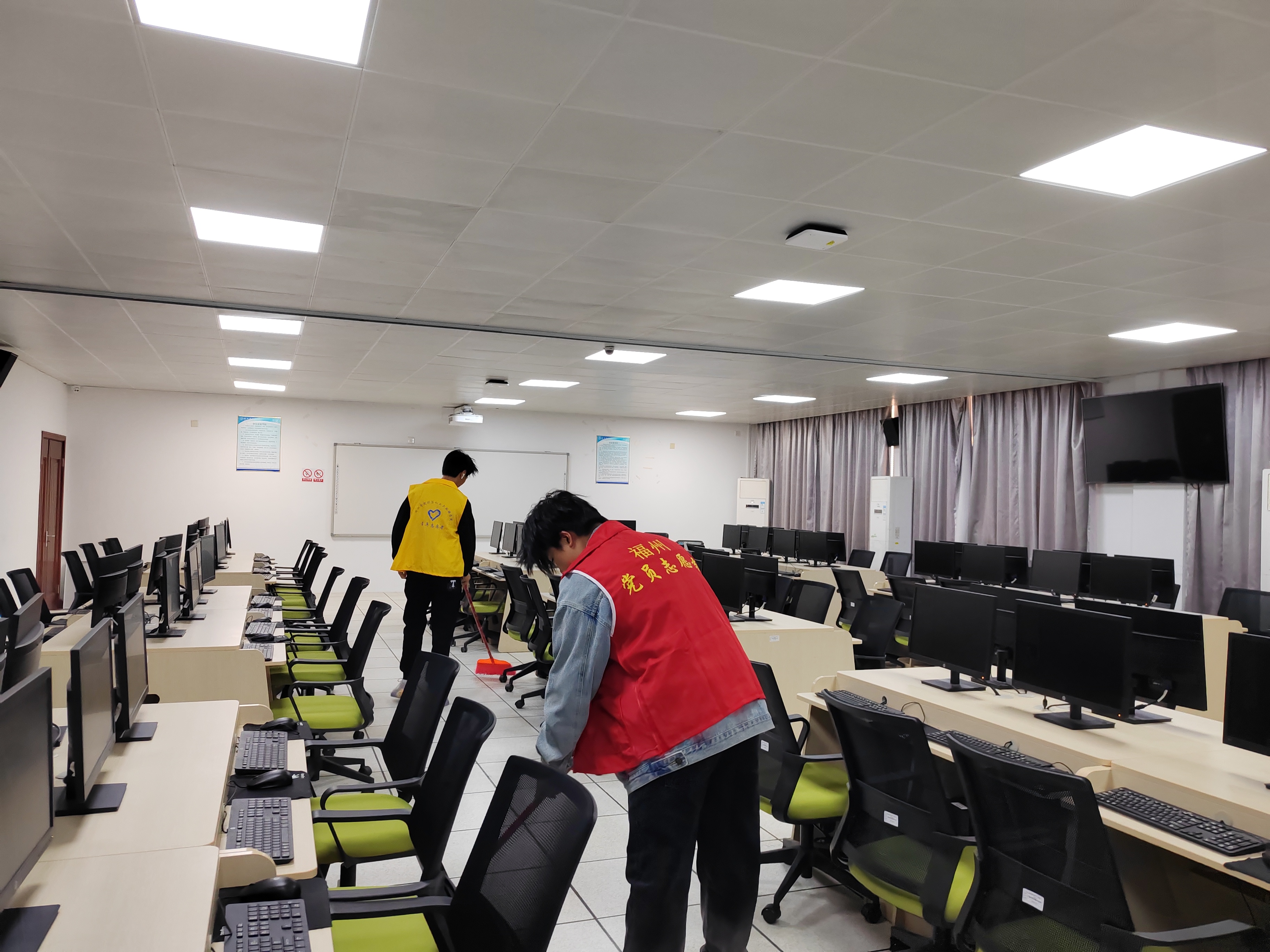 志愿者们根据负责人分配的任务,前往相应地点进行清扫。志愿者们认真地用湿抹布擦拭每张桌椅,整理书架、清扫地面,对于顽固污渍,齐心协力地反复清理,全程都展现出坚韧不拔的干劲与团结协作的精神。在工科楼A 座、B 座机房、务成楼及福万楼等地,志愿者们除清扫走廊、楼梯、教室等区域外,还协助排查并解决电脑开不了机、使用故障等问题,保障教学设备的正常运行,为学院的教学工作保驾护航。