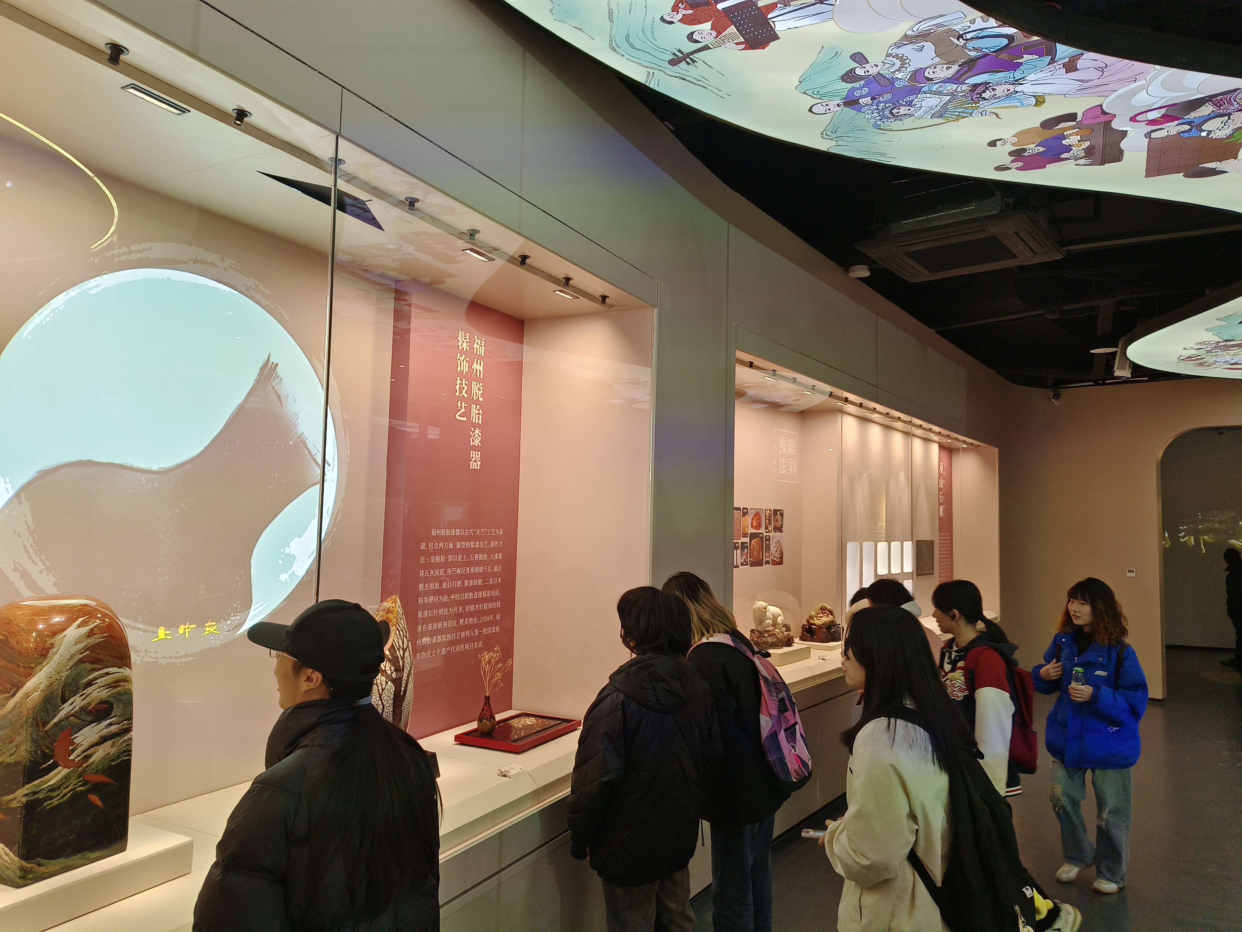 非物质文化遗产展厅陈列着龙舟、软木画、寿山石雕、脱胎漆器、畲族服饰、茉莉花茶、茶亭十番音乐等众多非遗项目,现代化的展陈技术为同学们打造了一个交互沉浸式的学习空间,详细的介绍与精美的实物吸引着众人目光。同学们观看福州非遗文化大数据,了解福州非遗文化的发展、保护历程,并在感兴趣的陈列项目前久久驻足。