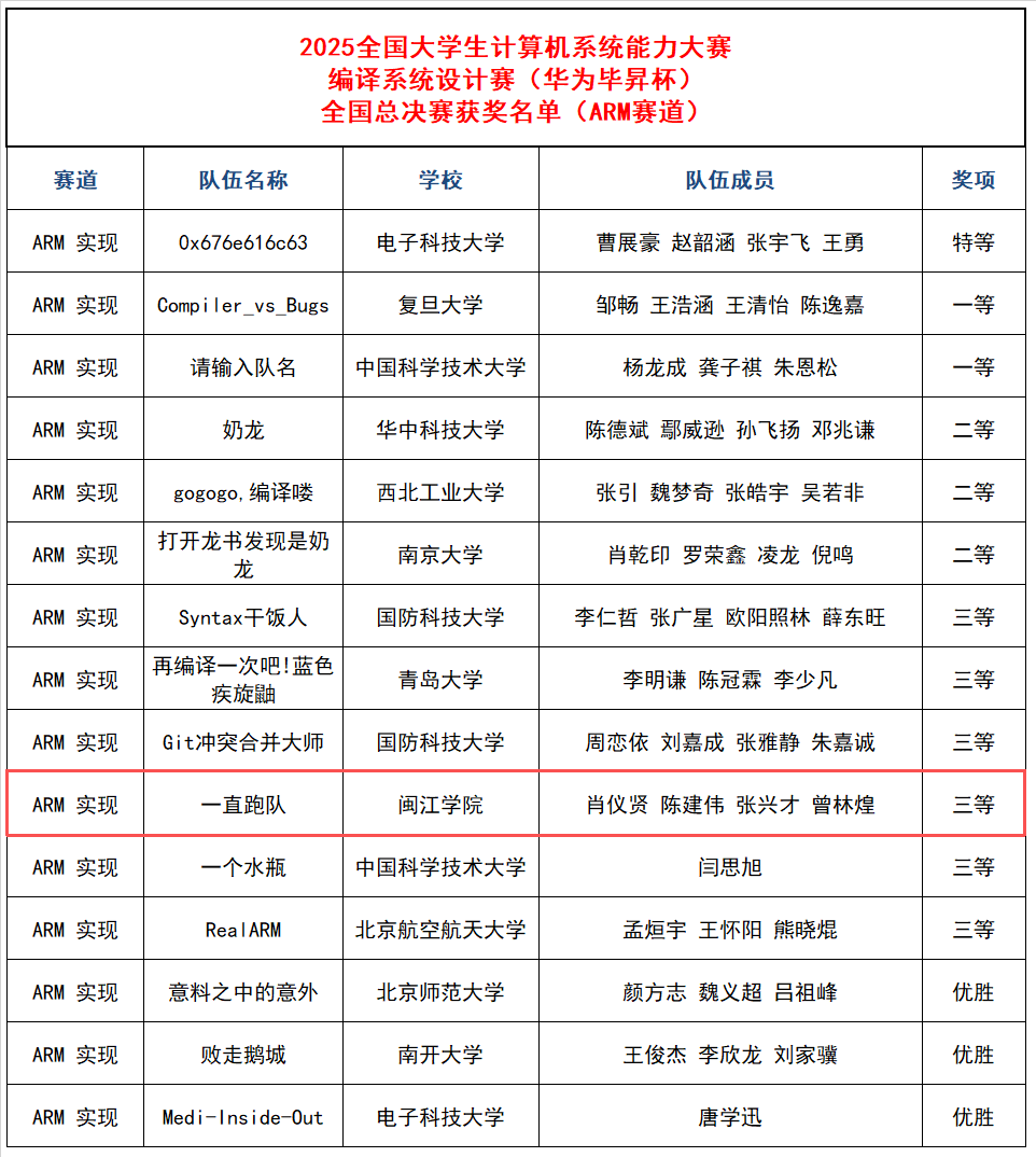 8月22日,2025年全国大学生计算机系统能力大赛编译系统设计赛(华为毕昇杯)全国总决赛在华中科技大学落下帷幕。经过激烈角逐,计算机学院李志鹏、郑国龙老师指导的两支参赛队伍脱颖而出,在ARM赛道和RISC-V赛道分别荣获全国三等奖和优胜奖。全国大学生计算机系统能力大赛是国家级A类赛事,参赛队伍以“双一流”建设高校为主,中文字幕 参赛队在该项赛事中首次参赛并首创佳绩,实现零的突破。