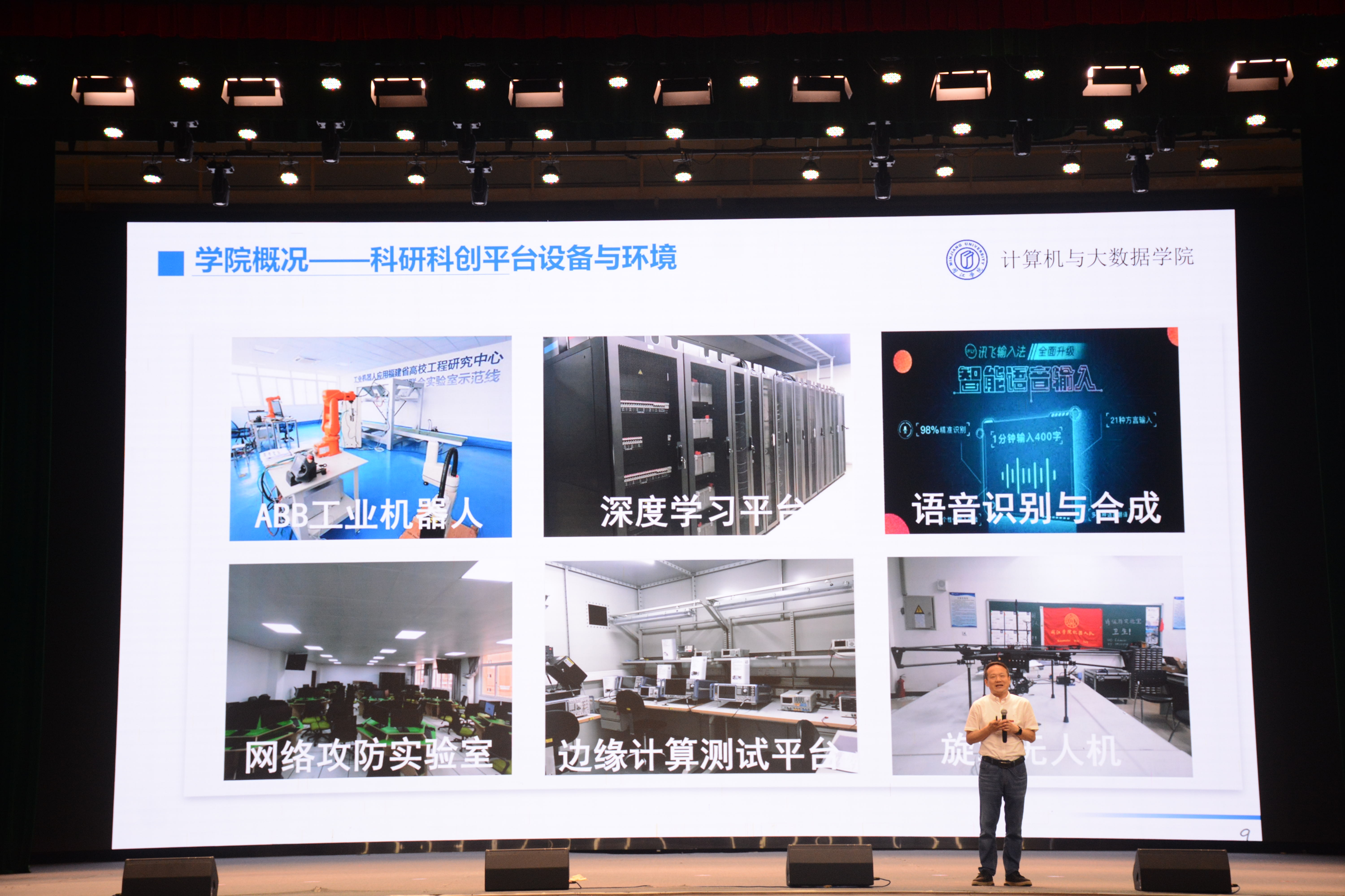 接着,孙知信院长深度解读了学院“项目驱动式人才培养模式”和“校企合作‘3+X’模式”两大核心人才培养特色与亮点,重点介绍了计算机学院落实立德树人的系列举措与成效,并为全体新生详细展示了近年来学院在科学研究、学生培养、合作交流、产教融合等方面取得的成就。他指出,计算机学院始终秉持“应用引领、创新驱动”的办学理念,致力于建设东南区域一流的计算机应用型人才培养高地,希望同学们能够珍惜在校时光,努力将自己塑造成德才兼备的复合型人才。