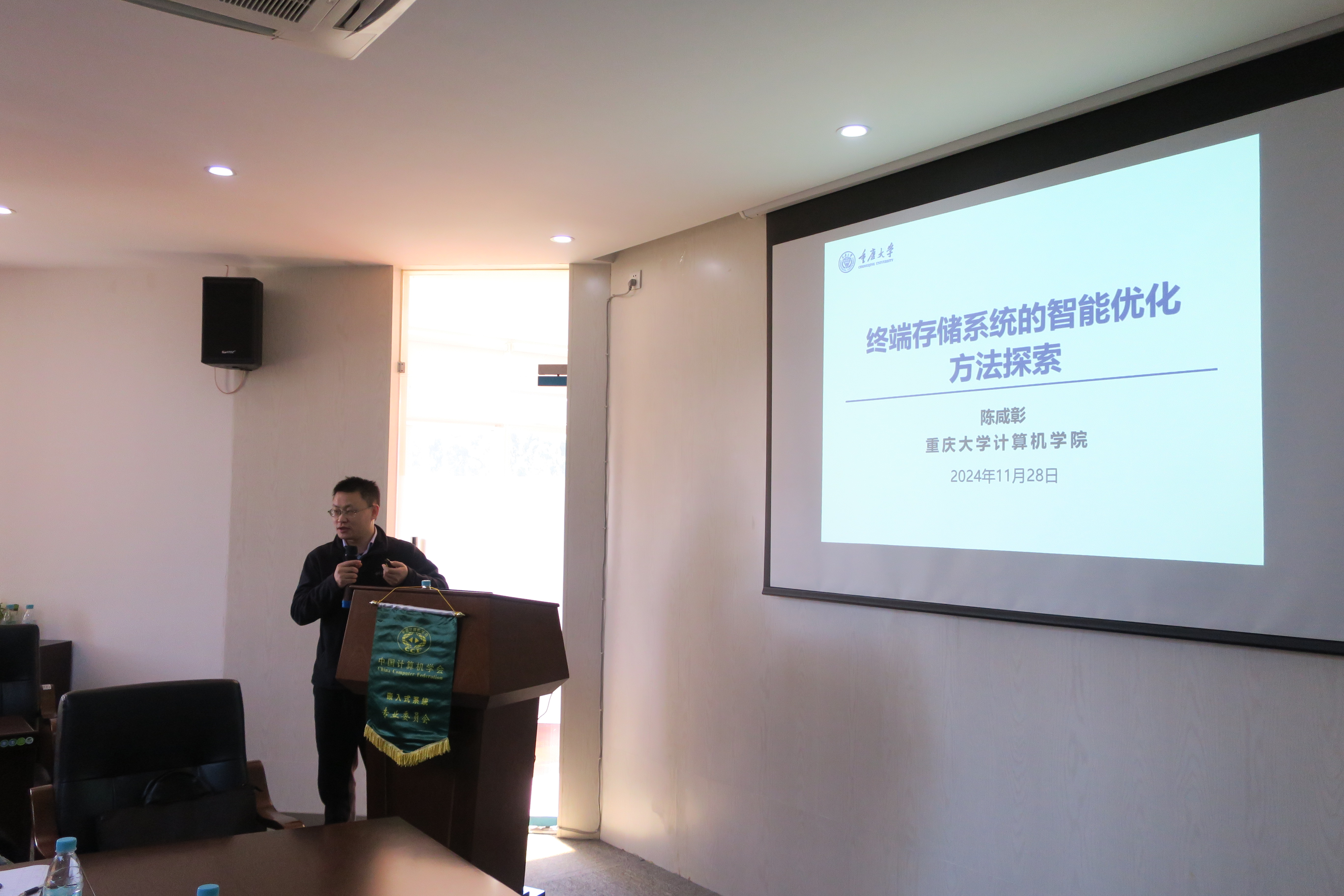 CCF嵌入式系统专委执委、重庆大学陈咸彰副教授以《终端存储系统的智能优化方法探索》为题做了报告。报告围绕如何发现复杂应用数据的存储与访问规律,并利用规律优化存储系统的设计与数据管理策略的问题,深入浅出地介绍了针对终端存储系统的智能优化方法,探讨高性能、低开销的智能终端存储系统的发展路径。