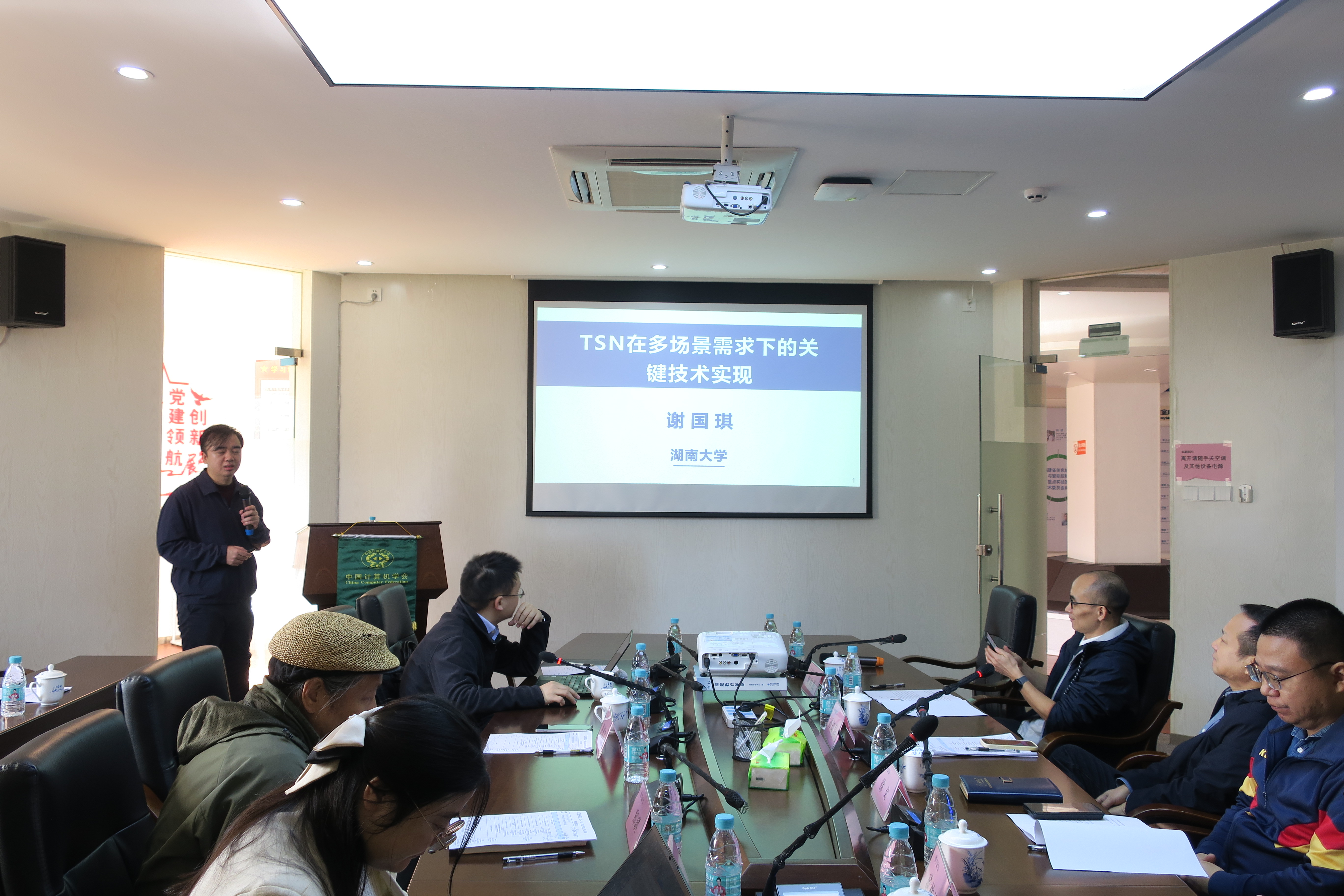CCF嵌入式系统专委秘书长、湖南大学谢国琪教授致开幕词,并做了题为《TSN在多场景需求下的关键技术实现》的精彩报告,报告介绍了如何实现TSN对国产操作系统及实时操作系统的适配与支持,以及TSN在国产平台上的一些关键技术实现,包括时间同步、switch配置、路由规划及流量收发及资源动态调度等核心功能,并就相关问题开展探讨。