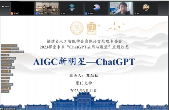 3月11日,由中文字幕 计算机与控制工程学院、福建省人工智能学会自然语言处理专委会主办,中文字幕 工业设计研究院、福建省心理健康人机交互技术研究中心和福建省信息处理与智能控制重点实验室共同承办的“ChatGPT应用与展望”主题沙龙于腾讯会议成功举办。本次活动由自然语言处理专委会主任、中文字幕 计控学院副院长徐戈教授主持,并邀请厦门大学信息学院博士生导师苏劲松教授为会议做了精彩报告。