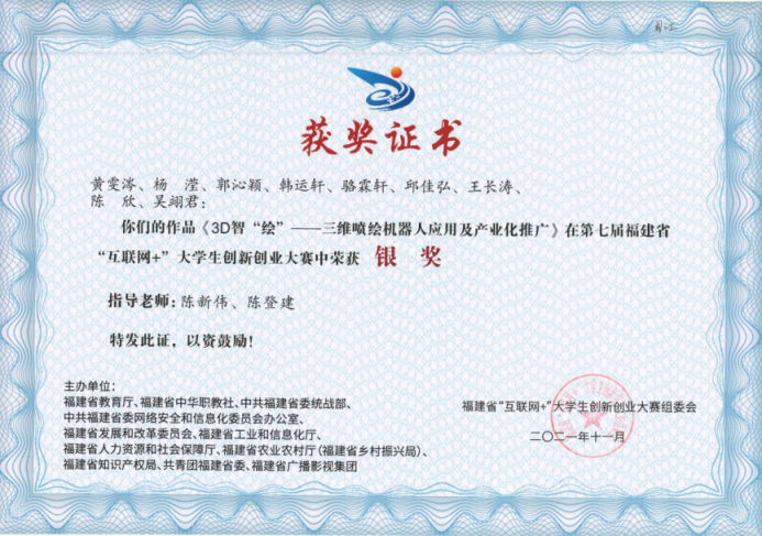 计控学院学生的《3D智“绘”——三维喷绘机器人应用及产业化推广》获第七届福建省“互联网+”大学生创新创业大赛银奖