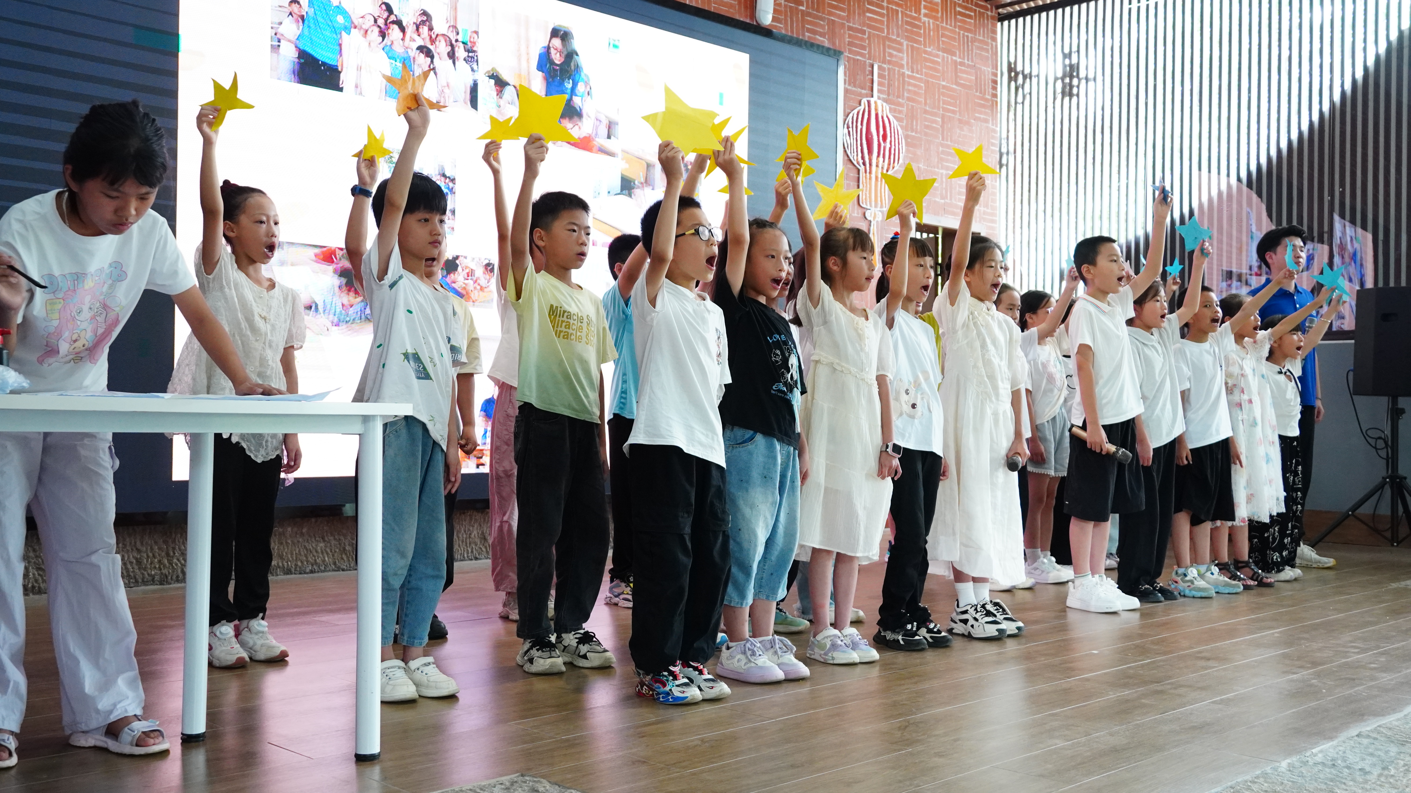 最后,全体暖风支教队员并肩走上舞台,当《我的未来式》旋律响起,他们眼中闪烁着温暖的光,歌声里满是青春的热忱与不舍。身后的大屏幕上,精心剪辑的视频缓缓流淌—— 从初遇时的羞涩微笑到课堂上的专注眼神,从课间嬉闹的欢快身影到手工课上的认真模样,每一帧都定格着夏令营的珍贵瞬间。