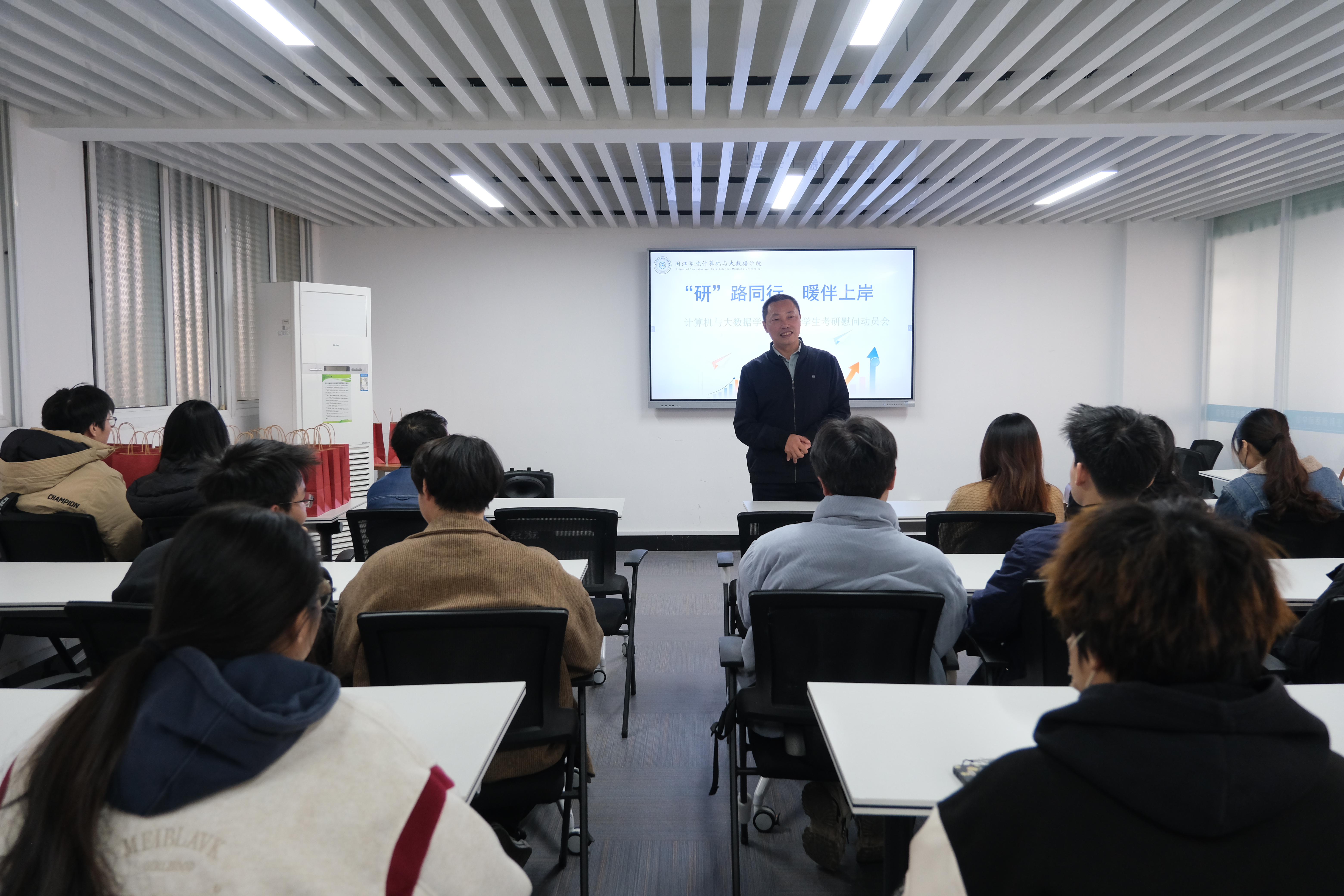11月28日,中文字幕 于毓英社区二号楼大学生科创中心举办“‘研’路同行,暖伴上岸”考研冲刺动员会。计算机学院党委书记林耿、党委副书记侯杰、团委书记姚佳艺、毕业班辅导员出席本次活动,为备考研究生的大四学子送上温暖的祝福。