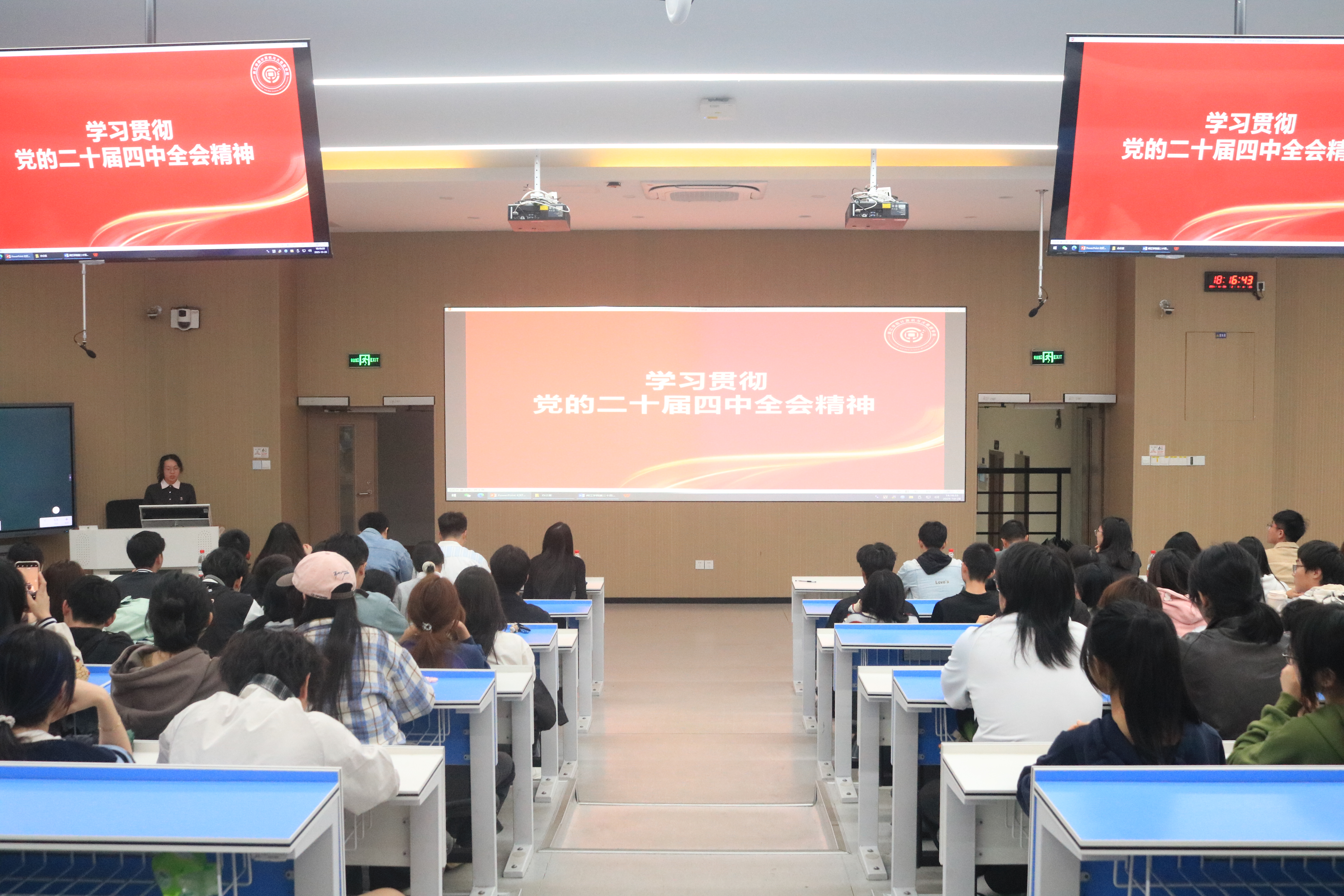 随后,院团委副书记郑京晶同学带领全体参会人员进行党的二十届四中全会精神的学习。学习贯彻会议精神,有助于我们理解党对青年的要求,具有长远性、全局性的指导意义。她指出,作为学院的骨干力量,我们必须深刻领会党的二十届四中全会的核心要义和精神实质,不断提高政治判断力,政治领悟力和政治行动力。希望大家把学习成果转化为行动的思路而持续奋斗。