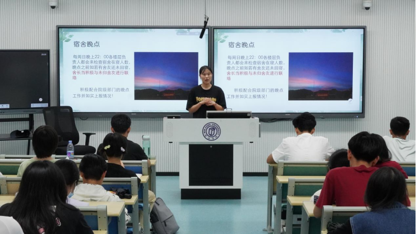 在新生舍长大会上,院团委社区管理部林滨炜围绕舍长职责展开详细说明。他强调,舍长作为宿舍“第一责任人”,要带头落实“门前三清”、坚决杜绝宿舍吸烟行为,积极配合完成每晚归寝登记,主动协调舍友关系,营造和谐融洽、积极向上的学习氛围。此外,他还介绍了社会志愿服务、舍歌大赛等丰富多彩的宿舍文化活动,鼓励舍长积极动员室友参与,共建活力寝室。会上还对“第三课堂”相关加减分规则及与奖学金的关联机制作了解读,为新生大学阶段的成长路径提供清晰指引。